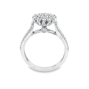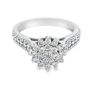 This fabulous diamond ring hosts a total of 1.00 carat of diamonds set in 14k white gold. This wedding ring hosts a beautiful cluster diamond flower head with duos of smaller diamonds on each side of the shank to add to beauty and sparkle. Your love is as fresh and new as a delicate flower. Promise to love her forever with this everlasting blossom that will never fade away.