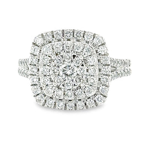 Exquisitely hand crafted in 10K white gold, this engagement ring features a round diamond halo with a floral center. The diamonds have a total weight of 1.00TDW and sparkle with fire and brilliance. The floral center consists smaller diamonds that form a flower shape and surrounded by a double halo of smaller diamonds. The ring has a split shank design that adds more elegance and style. This engagement ring is a perfect choice for expressing your love and commitment.