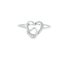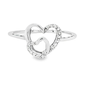 Add femininity to any look with this 10K white gold heart that features delicate small details of 0.08ct prong set round cut diamonds. The center is set with double heart together with small brilliant diamonds in prong set to creates an exquisite look. Finished to a bright polish this ring captivates with diamond shimmer and metallic shine.
