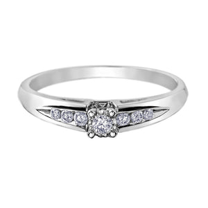 10K white gold 0.14TDW diamond promise ring. This delicate and rich-looking promise ring hosts a 0.04ct diamond in a White Gold miracle plate to give it a bigger illusion and looks stunning. It also has three small diamonds on each side of the center diamond to give it a rich look.