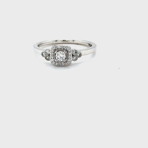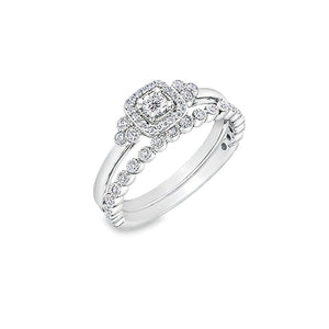 This wedding set is a gorgeous display of sparkle and elegance. It features a 0.11 carat Canadian diamond as the center stone, which is certified to be ethically sourced and of high quality. The center diamond is set in a four claw setting and surrounded by a cushion halo of round diamonds in claw settings. The band of the engagement ring has three round diamonds on each shank, adding more glamour and shine. The wedding band is a semi eternity design, with round diamonds in claw settings along the band. The total diamond weight of the wedding set is 0.23 carats. The wedding set is crafted in 10K white gold, which enhances the beauty and durability of the diamonds.
