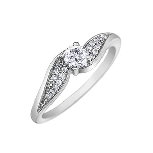 10K white gold 0.27TDW Canadian diamond engagement ring hosting a 0.18ct Canadian diamond solitaire with small pave set diamonds on each shoulder which has a pretty wave. Enchant and delight her with this beautiful Canadian diamond engagement ring.