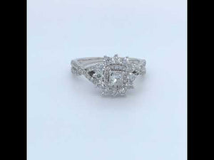 14KW 1.00TDW Princess Cut Solitaire With Halo Side Diamond Engagement Ring. Sparkling Princess Cut solitaire is surrounded by accent diamonds in the halo and the outer halo is designed to give it a Ballerina look with slightly larger diamonds set on claws. The center is hosted by infinity sides which means Eternal Love.