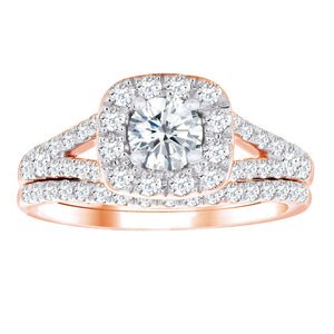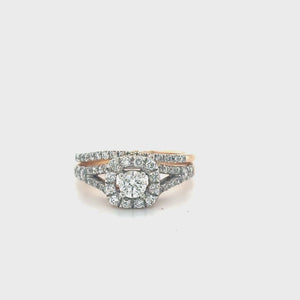 14K rose gold 1.00TDW diamond bridal set with halo setting. This beautiful halo ring hosts a large brilliant round diamond in the center surrounded by a halo of smaller diamonds creating an amazing look. Duos of accented diamonds are set on the shoulder and the band to add to sparkle. Radiant with diamonds, this bridal set is finished with a bright polished shine.