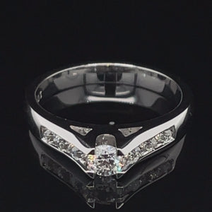 This beautiful 14k white gold solitaire engagement ring 0.29 carat of total diamonds. This stunning engagement ring hosts a large diamond to embellish the center. It also has three small diamonds in channel-set on both shoulders of ring to enhance the brilliance.