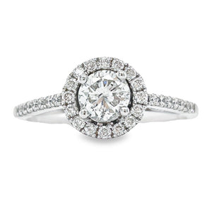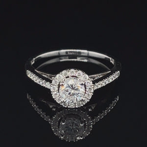 14K White Gold 0.67TDW Diamond Round Halo Wedding Set. This elegant halo ring hosts a brilliant round 0.42ct diamond at the center surrounded by a halo of smaller diamonds adding to the sparkle. Duos of accented diamonds are set on the shoulder and the band to give it a stunning look.