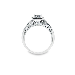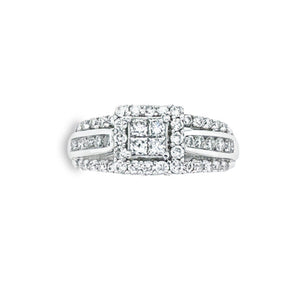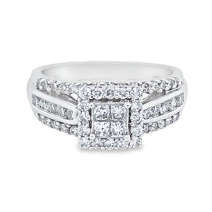 14K White Gold 1.00TDW Diamond Quad Princess Cut Halo Engagement Ring. This stunning ring is comprised of four princess cut diamonds weighing approx 0.20 carat of total diamonds giving it a big illusion of approx three-quarter carat of center diamond. All other 56 side diamonds add up to 0.80 carats of total diamonds. On the day you ask for her hand, enchant and delight her with this beautiful halo ring with a beautiful setting encompassing three rows of diamonds on each side. Exquisite handmade artistry is used in this 1.00tdw diamond ring. Perfect for any occasion, at weddings, engagements, anniversary, valentine's day or surprise her for a special occasion or celebration.