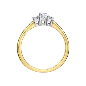 Exquisitely handcrafted in 14K yellow gold, this diamond engagement ring is a symbol of love and commitment. The ring features a 0.11 carat round center diamond, flanked by two smaller round diamonds on either side. The band of the ring has channel set diamonds on the shoulders, adding more sparkle and elegance. The ring has a total diamond weight of 0.25 carats.