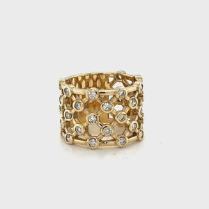This exquisite ring showcases a modern broad design with an openwork pattern in 14K yellow gold. The ring is embellished with multiple diamonds that have a total weight of 1.00 carats. The diamonds are scattered throughout the ring, creating a dazzling effect. This ring is a stunning piece of jewelry that will add elegance and style to any outfit. Whether you wear it as a statement piece or a gift for someone special, this ring will make you stand out from the crowd.