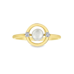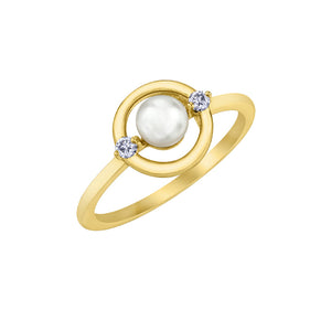 This beautiful ring features a white pearl in a gold circle, surrounded by two round-cut Canadian diamonds on a twisted yellow gold band. The diamonds have a total weight of 0.06 carats and are of high quality and clarity. The pearl is 5 mm in diameter and has a lustrous shine. This ring is a classic and timeless piece of jewelry that will enhance any look.