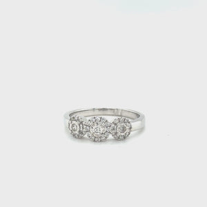 Elegantly hand crafted in 0.25TDW and 10k white gold. This elegant ring features three slightly large round diamonds are set in the center, surrounded by a halo of smaller diamonds that add extra sparkle and shine. The ring is crafted in 10K white gold and has a polished finish. The band is plain and simple, letting the diamonds take the center stage. This ring is a classic choice for any occasion, whether it’s an engagement, anniversary, or just a treat for yourself. It will make you feel beautiful and sophisticated every time you wear it.