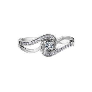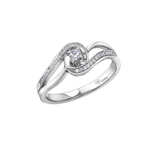 This ring is a stunning piece of jewelry that features a 0.08-carat round diamond in the center. The ring is made of 10K white gold and has a twisted band design with smaller diamonds on the band. The ring has a total diamond weight of 0.17 carats and a polished finish. This ring is perfect for anyone who loves a unique and elegant style with a lot of sparkle.