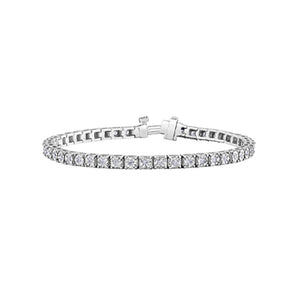 Exclusively hand crafted in 10K white gold, this bracelet features a seamless row of illusion-set round-cut diamonds totaling 1.00 carat. Each stone is framed to enhance its size and brilliance, creating a continuous sparkle across the wrist. The clean, modern design offers timeless sophistication—perfect for layering or making a subtle statement on its own.
