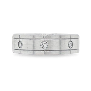 Exclusively hand crafted to perfection this 0.12tdw diamond women's satin finish band. This elegant band has three diamonds at the center in stackable to enhance the radiance which can be worn everyday to make a statement of style. The simplicity of this piece with its classic round cut brilliant diamonds makes it the perfect accessory for all occasions.