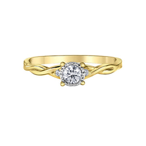 This delicate 10K yellow gold promise ring features a 0.20 carat total weight of round-cut diamonds, centered by a brilliant solitaire flanked with two accent stones. The twisted band adds a graceful, romantic touch, symbolizing connection and commitment. A timeless piece that speaks softly of love, loyalty, and meaningful beginnings.