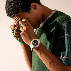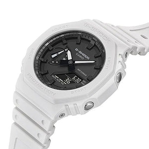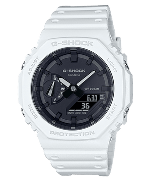 The new classic GA2100 model incorporates the octagonal form of the original G-SHOCK DW5000C. The case is made of fine resin embedded with carbon fibers, making the thin, lightweight, and simple design configuration of this model possible. The new white band and bezel GA2100-7A is combined with a black face for a cool, refreshing look. Double LED light for the face (Super illuminator, selectable illumination duration (1.5 seconds or 3 seconds), afterglow). LED backlight for the digital display (Super illuminator, selectable illumination duration (1.5 seconds or 3 seconds), afterglow). Size of case: 48.5 x 45.4 x 11.8mm. Mineral glass, shock resistant, carbon core guard structure, 200-meter water resistance.