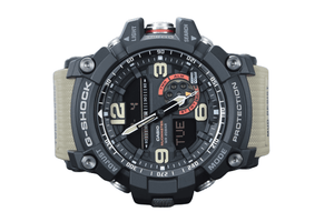 G-Shock Master of G analog digital mens watch GG1000-1A5. Stainless steel and resin case with a tan resin strap. Fixed bezel. Black dial with silver-tone hands and index and Arabic numeral hour markers. Dial Type: Analog-digital. Quartz movement. Scratch resistant mineral crystal. Size of case: 55.3 mm x 56.2 mm x 17.1 mm. Round case shape. Tang clasp. Water resistant upto 200 meters / 660 feet. Functions: hour, minute, second, full-auto calendar, digital compass, thermometer, world time, countdown timer, 5 daily alarms, hourly time signal, 12/24 hour format. Additional Info: this watch is shock and mud resistant. Casual watch style.