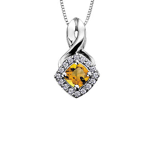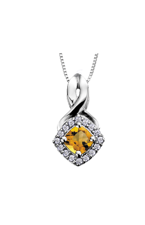10k White gold 0.08tdw Diamonds and a cushion Citrine gemstone measuring approximately 4x4mm is beautifully set in a cushion halo setting. Elegant and graceful, this brilliant diamond and Citrine pendant showcases a halo of sparkling diamond surrounding the center gemstone. A perfect gift for birthdays, anniversaries, mother's day, and graduation. Matching earrings and a Ring Can be purchased separately to complete the set.