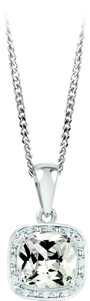 April Birthstone pendant set in Sterling Silver with diamond accent around the large centre synthetic White Topaz CZ. It is a beautiful pendant designed to bring out the true colour of the centre gem. Pendant comes with an 18" Sterling Silver Chain. It is a perfect gift for yourself or for someone special to celebrate the special birthday or other memorable occasions.