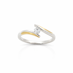 This uniquely designed women’s ring features a 0.15 carat lab-grown diamond set in a sleek 10K yellow and white gold band. This solitaire wave engagement ring hosts a big round diamond embelish the center to add to glitter. Solitaire connects the two sides and sits on top of the shoulders to give it a rich and stunning look.