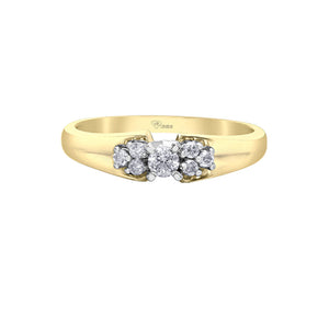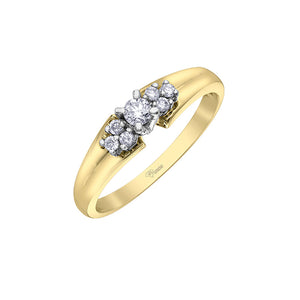 This glorious 10k yellow gold Canadian diamond ring hosts 0.20 carats in total weight. The ring features a central round Canadian diamond weighing 0.11 carats, held securely by four prongs. Additional smaller diamonds are set into the band, adding extra sparkle and elegance. This ring has a classic and timeless design, making it a beautiful choice for an engagement ring.