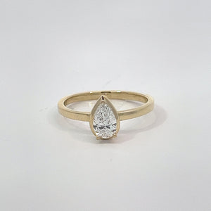 This beautiful ring features a 0.50-carat lab-grown diamond in a graceful pear shape, elegantly set in 10K yellow gold. The diamond is held securely by three prongs, allowing its brilliance to shine through. The warm glow of the yellow gold complements the sparkle of the diamond, creating a timeless and stylish piece. This ring elegantly combines the classic appeal of yellow gold with the modern allure of lab-grown diamonds, making it a perfect choice for a timeless yet contemporary ring.