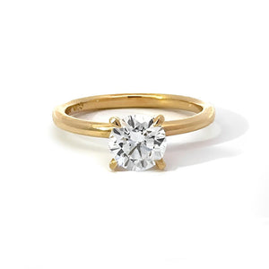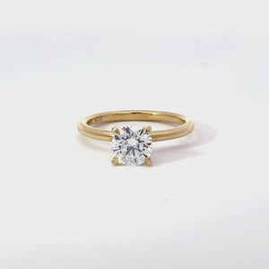 This elegant ring hosted a 1.04 carat round lab-grown diamond set in the center solitaire setting and brilliantly hand-crafted in 14K yellow gold. The round-cut diamond creates a stunning and unique look. This ring is perfect for anyone who loves a classic and simple design. The diamond will be IGI certified and the certificate will accompany the ring.