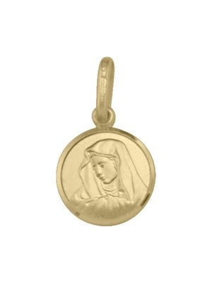 10, 14 Karat Yellow Gold Solid Madonna Medalion. The image of Mary and her child Jesus is represented on the Madonna and Child Disc Charm. The term Madonna, from the ancient form of "my Women's", is a representation of the Great Mother Known by Catholics. It is very small in size. The elaborately designed round shape protective pendant with the motif of the holy Madonna.