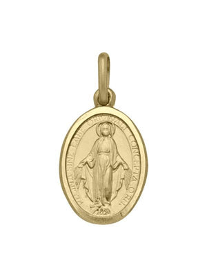 10, 14 Karat Yellow Gold Solid Miraculous Medalion. The Miraculous Medal is a popular religious medal, and for good reason: it comes from Heaven. It is a small size Medalion. When wearing a Miraculous medal pendant, ask for our loving Mothers graces and protection. She is our Mother and she loves us!