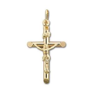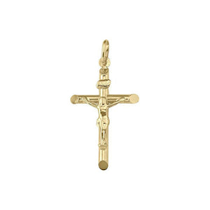 10, 14 Karat Yellow Gold Medium Italian Cross Pendant with Crucifix. This is a very popular Crucifix style. It has a fancy design with a cross made out of a hollow tube and crucifix on top of it. This fine piece of jewellery is a terrific embodiment of the fusion between elegant style and true Christian devotion. This Crucifix is for those who put their faith in a higher power; who want to have a special connection and feel Him close; to feel His protective presence all day. Look amazing while inspiring others. This Beautiful Crucifix is a perfect gift for both men and women. Excellent gift for a Birthday, Religious Holiday, Anniversary, Valentine's Day, Mother's Day. It comes in a high-quality Jewellery box or a pouch for easy gift giving.