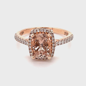 10k rose gold 0.35tdw Diamonds and a emerald cut Morganite gemstone measuring approximately 8x6mm are beautifully set in a emerald halo setting. Elegant and delightful, this brilliant diamond and Morganite ring showcase a halo of sparkling diamonds surrounding the center gemstone. The shoulders of the ring hosts sparkling round diamonds to enhance the brilliance. A perfect way to celebrate an Anniversary, Engagement, Mother’s Day, Christmas, Birthday, Valentine’s Day, or just because!