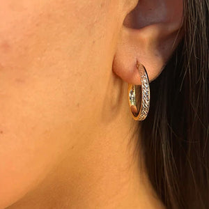 10k White and Yellow Gold Fancy Broad Hoop Earrings. These hoop earrings have a laser cut front on white gold with yellow gold on the inside of the hoop This classic hoop earrings are great for adding elegance to everyday outfits. These beautiful hoops are light in weight and very comfortable to wear. The perfect earring for any ocassion you will never want to take off.