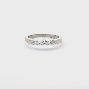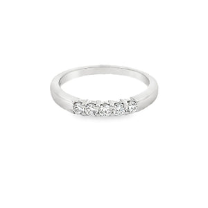 This exquisite 10K white gold band features five lab-grown diamonds with a total diamond weight (TDW) of 0.25 carats. The diamonds are evenly spaced and set in a row along the top of the band, adding a touch of sparkle and sophistication. With a smooth, polished finish, this band effortlessly combines classic appeal with the modern and ethical choice of lab-grown diamonds. Perfect for special occasions or everyday wear, this ring is a beautiful and responsible choice for those who appreciate both style and sustainability.