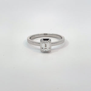 This stunning 10K white gold ring features a dazzling 0.50-carat lab-grown diamond with an emerald cut. The sleek and simple band highlights the central diamond, showcasing its clarity and brilliance. Perfect for any occasion, this ring is a modern and eco-friendly choice that combines timeless beauty with contemporary style.