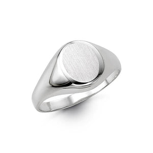 10K White Gold Mens Oval-Shaped Signet Ring. The uniquely raised oval center, bordered by high-polish white gold, makes a stylish statement to those share your busy days and leisurely nights.Wear this handsome signet ring just as it is or engraved with your initials.