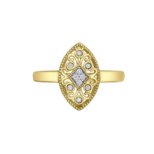 Exclusively hand crafted this 10K yellow gold antique-style ring embodies vintage elegance with intricate detailing on the band. Adorned with 0.05TDW diamonds, it exudes a delicate sparkle, adding a refined touch to its timeless design. Perfect for those who appreciate classic craftsmanship and sophisticated charm.