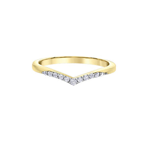 This unique ring features a 10K yellow gold band with two curved lines of sparkling diamonds that meet in the center. The ring has a total diamond weight of 0.12 carats and showcases the beauty and brilliance of the round diamonds. This ring is a stylish and modern accessory for any occasion.