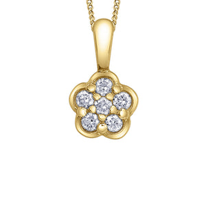 This exqisite 10K yellow gold floral pendant showcases a delicate bloom-inspired design. The intricate petals curve gracefully, creating a soft, feminine silhouette. Sparkling 0.12TDW diamonds are strategically placed to accentuate the floral pattern, enhancing its brilliance and depth. The contrast between the warm gold and the dazzling diamonds adds a sophisticated touch, making this pendant a radiant centerpiece for any occasion.