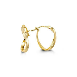 10k Yellow Gold Fancy Hoop Earrings. These hoop earrings have a fancy twist with yellow gold having special finish on the front to add character and beauty. This classic hoop earrings are great for adding elegance to everyday outfits. These beautiful hoops are light in weight and very comfortable to wear. The perfect earring for any ocassion you will never want to take off.