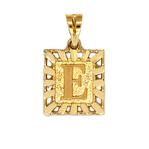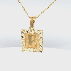 Beautifully hand-crafted initial letter E square pendant in 10K yellow gold. This stunning square pendant can be worn by it self or layered with other pendants. Perfect gift for Mothers Day, Birthdays, Valentines Day, Graduation, Christmas or just about any other occasion. CHAIN IS NOT INCLUDED.