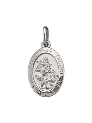 14 Karat White Gold Solid Saint Christopher Medallion. Saint Christopher is one of the most popular Catholic Christian heroes of the Faith. Medalion size is suitable for all ages. St. Christopher has a cultural association with protection, and people have been giving medallions and necklaces bearing his likeness to their traveling loved ones.