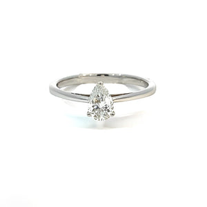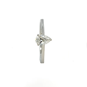 This beautiful ring crafted from 14K white gold that beautifully complements the 0.50 carat pear-shaped lab-grown diamond at its center. The diamond is prominently displayed, showcasing its clarity and unique pear shape. Perfect for those who appreciate classic elegance with a modern touch. Ideal for engagements or special occasions, this ring combines the traditional allure of white gold with the contemporary appeal of lab-grown diamonds.