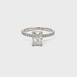 This exquisite engagement ring crafted from 14K white gold. This beautiful ring features a central lab-grown radiant diamond weighing 1.51 carats, surrounded by a total diamond weight (TDW) of 1.78 carats. The band is adorned with smaller diamonds, adding to the ring's overall brilliance and elegance. The radiant cut of the central diamond enhances its sparkle and makes it a captivating piece of jewelry. The diamond will be IGI certified and the certificate will accompany the ring.