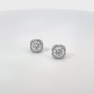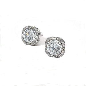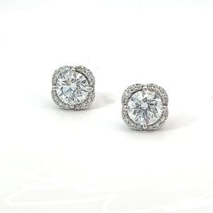 14K White Gold 2.20TDW Lab Grown Diamond Fancy Earrings. Each earring features a central round-cut diamond, surrounded by a halo of smaller diamonds, all set in 14K white gold. The central diamonds are lab-grown, contributing to a total diamond weight (TDW) of 2.20 carats. The intricate design and high-quality materials make these earrings a luxurious and eye-catching accessory.