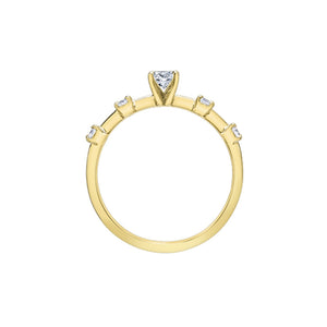 This exqisite Canadian diamond engagement ring crafted from 14K yellow gold and 0.50 carats in total diamond weight (TDW). This ring features a central oval diamond, weighing 0.30 carats, flanked by smaller round diamonds on either side. The diamonds are set in a delicate and elegant band, making this ring a beautiful and timeless piece of jewelry.