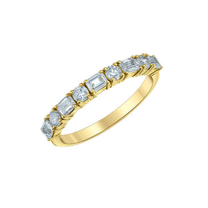 This gorgeous band is crafted from 14K yellow gold and adorned with a harmonious blend of lab-grown diamonds and emerald-cut stones, totaling 0.75 carats. Each gem is prong-set in a continuous row, offering a sleek silhouette and refined sparkle. The contrast between the diamonds’ brilliance and the emeralds’ rich hue creates a timeless piece—perfect for stacking or wearing solo as a statement of modern luxury./p>
