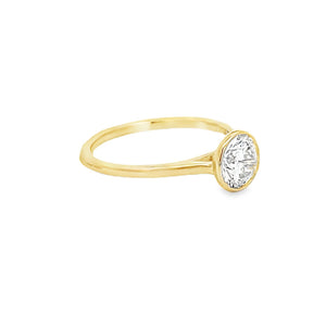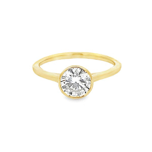 This elegant 14K yellow gold ring features a 1.04-carat lab-grown diamond set in a bezel setting. The ring boasts a simple yet elegant design with a smooth, polished gold band that beautifully highlights the central diamond. The bezel setting securely encases the diamond, providing a modern and sleek appearance while ensuring the stone is well-protected. This ring is a perfect choice for anyone who loves a classic and simple design.