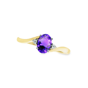 February Amethyst Birthstone Ring with Genuine Diamond accent on both sides of the centre stone set in 10k Yellow Gold. It is a beautiful delicate ring designed to bring out the true colour of the centre gem. It is a perfect gift for yourself or for someone special to celebrate the special birthday or a memorable moment.
