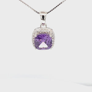 February Birthstone cushion-cut Purple CZ Stone pendant set in Sterling Silver with Cubic Zirconia stones. It is a beautiful pendant designed to bring out the true colour of the centre gem. Pendant comes with an 18" Sterling Silver Chain. It is a perfect gift for yourself or for someone special to celebrate the special birthday or other memorable occasions.