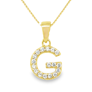 Yellow Gold Plated Sterling Silver Cubic Zirconia Letter G Pendant. This pendant is a stylish and personalized accessory that features the letter G in cubic zirconia stones. The pendant is made of sterling silver and plated with yellow gold for a luxurious look. The pendant comes with a matching silver chain that complements the pendant’s shine. This pendant is a great gift for yourself or someone who has the initial G in their name. It is a versatile piece that can be worn with any outfit and for any occasion.
